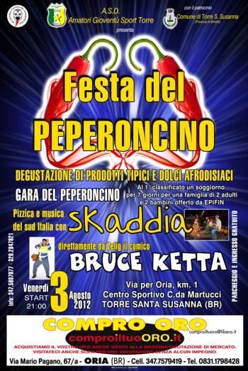 dell’Amministrazione Comunale di Torre Santa Susanna, organizza venerdì 3 agosto una notte piccante!!!La III edizione della “Festa del Peperoncino” che si terrà a Torre Santa Susanna sulla provinciale per Oria Km 1,5 in Contrada Martucci.