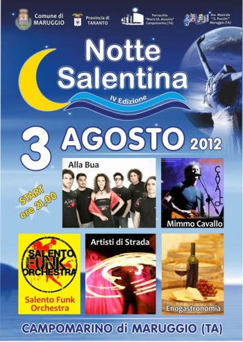 Salentina, la notte bianca promossa dal Comune di Maruggio, insieme alla Provincia di Taranto, alla parrocchia “Maria SS. Assunta” e all’associazione musicale “Puccini”.Tante le attrazioni che animeranno le varie zone di una delle località più belle della provincia di Taranto. L’assessore al Turismo, Alfredo Longo, è riuscito ad ottenere la presenza di tre “assi” della musica.