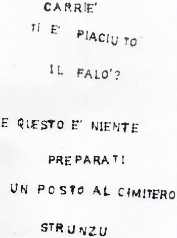 «Non solo minacce, ma anche sberleffi!» è l’amaro commento di Mimmo Carrieri. «Il contenuto della lettera minatoria recapitatomi per posta é eloquente. Devo comunque ringraziare pubblicamente il Comandante la Stazione dei Carabinieri di Sava, Luogotenente Edoardo Quaranta, che oltre a condurre le indagini per risalire agli autori e ai mandanti dell’attentato intimidatorio, si é preoccupato personalmente di tranquillizzare la mia famiglia, assicurando la massima attenzione sotto il profilo della sicurezza per l’incolumità fisica. Per quanto mi riguarda, spero che quanto prima questa triste vicenda possa essere chiusa magari con l’identificazione di coloro che hanno compiuto questo ignobile gesto».