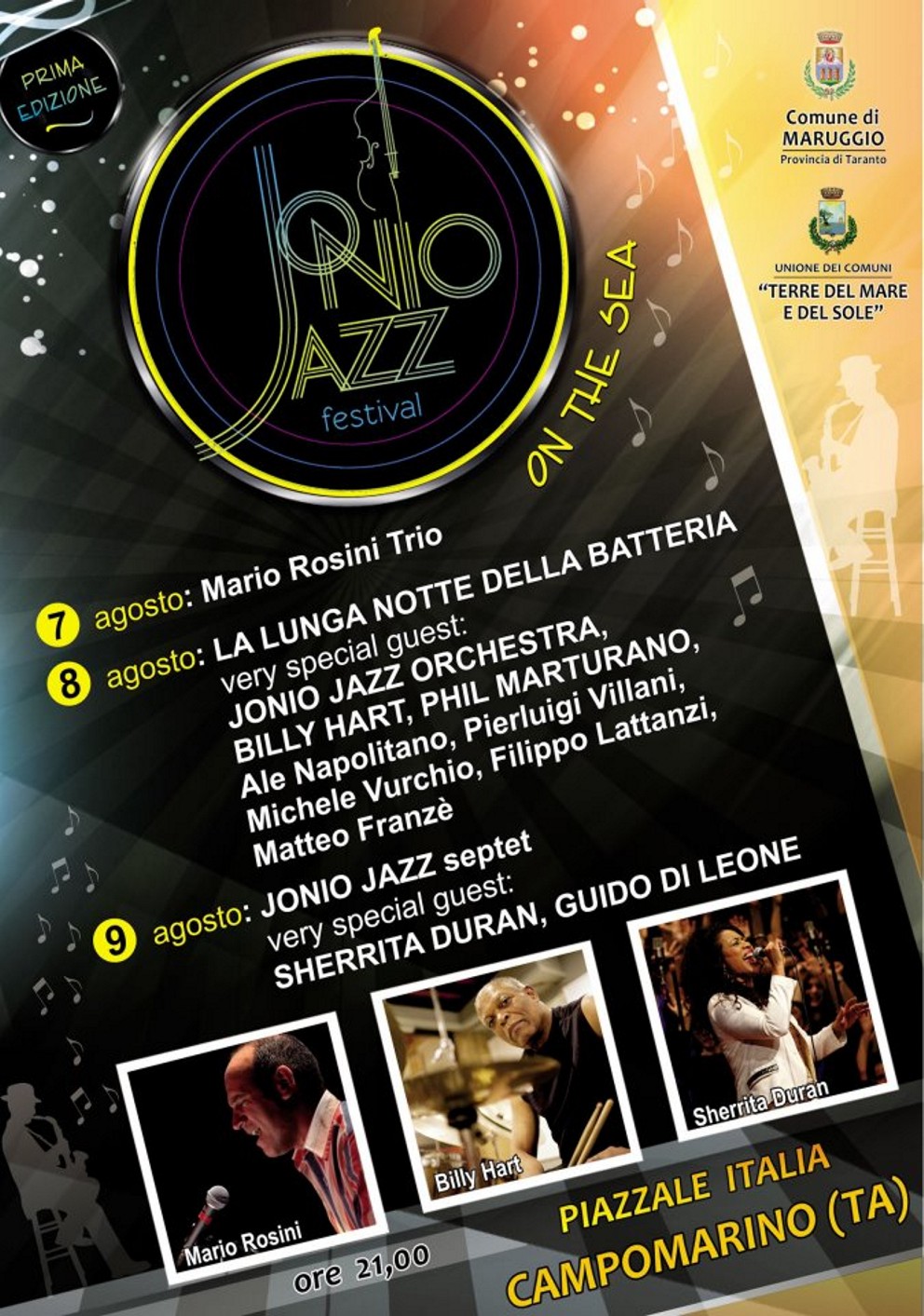 prima edizione dello Jonio Jazz Festival, manifestazione promossa dal Comune di Maruggio e sostenuta anche dall’Unione dei Comuni delle Terre del Mare e del Sole.Domani, sempre in piazzale Italia, la Lunga Notte della Batteria: si alterneranno, sul palco, la Jonio Jazz Orchestra, Billy Hart, Phil Marturano, Ale Napoletano, Pierluigi Villani, Michele Vurchio, Filippo Lattanzi e Matteo Franzè.
