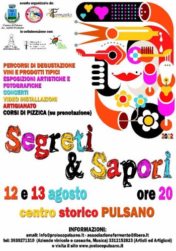 Pulsano, la Pro Loco locale, il Gal Colline Joniche, in collaborazione con l’associazione culturale Fermento, l’associazione Alternativamente e l’associazione Ludosphaera propongono due serate articolate in un percorso tra le tipicità delle nostre zone, intese da un punto di vista enogastronomico, artistico e musicale. Un concentrato di attività che si snoderanno nel centro storico di Pulsano e i cui ingredienti saranno: percorsi tra i profumi, i colori, i suoni, la fantasia e le tipicità delle nostre zone .Cantine, ristoratori e imprenditori locali qualificati metteranno in vetrina diverse specialità enogastronomiche, prodotti in degustazione e prodotti in vendita.