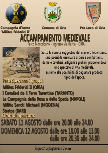 All’Accampamento Medievale prenderanno parte i gruppi: Arcieri Storici Stupor Mundi di Oria, gli Arcieri Svevi di Oria, i Cavalieri Teutonici di Mesagne, La Compagnia della Spada Spezzata di Turi (BA) ed i duellanti dell’Accademia di Scherma Federico II di Oria.