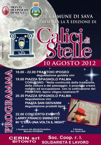Stelle, la manifestazione lanciata dall’associazione nazionale “Città del vino”, che si svolge, ogni anno, nella notte di San Lorenzo per brindare alle stelle cadenti.In Puglia, quest’anno, Calici di Stelle avrà luogo, oggi, solamente a Sava. Per quest’occasione, l’Amministrazione, guidata dal nuovo sindaco Dario Iaia, ha preparato (grazie all’impegno dell’assessore alle Attività Produttive, Maurizio Pichierri), un gala del Primitivo, elemento portante dell’economia locale.