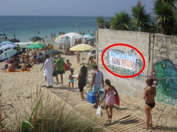 Della giornata che segna il clou dell’estate, vogliamo segnalarvi due episodi significativi. Un nostro lettore ci ha segnalato che in via delle Tuberose (una strada che porta al mare a qualche decina di metri dal complesso turistico “Hotel dei Bizantini”), nella giornata di Ferragosto, su un muro attiguo alla passerella che consente di arrivare sino