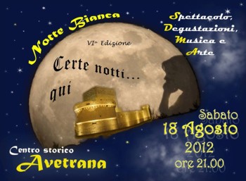 partire dalle 21.30, l’omonima associazione onlus propone “Certe Notti Qui...la Notte Bianca Avetranese 2012”, evento giunto ormai alla sua sesta edizione, che ha sempre goduto di un vasto consenso di pubblico locale e di turisti.