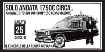 sua residenza di Apani, in contrada Baccatani. Sono graditi sorrisi, balli, casino, pane, amore e fantasia! No musi lunghi & piagnistei! In fondo, è solo un arrivederci, mica un addio! Giovanna tornerà, come ogni anno, all’inizio della prossima estate con una vagonata di eventi, musica, ospiti, performance e arti varie. Quest’anno il funerale, festa conclusiva della stagione del Baccatani Wave, sarà una cerimonia d’onore. Gangster, bulli e pupe si riuniranno a dare il poco estremo saluto alla regina. Grandi ospiti celebreranno la sua dipartita nel segno della musica e del divertimento.