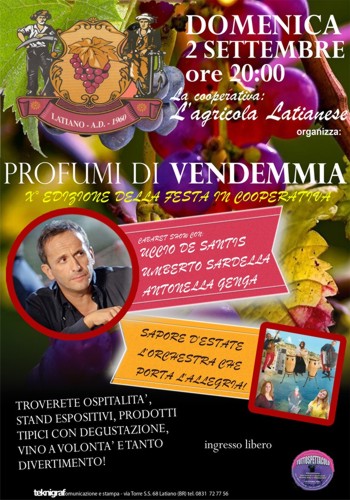 aprono per accogliere i visitatori in una serata di allegria e divertimento, ma anche per dare il benvenuto alla vendemmia. Si svolgerà domenica prossima 2 settembre, a partire dalle ore 20, la decima edizione della festa sociale della coop. L’Agricola Latianese, da quest’anno denominata “Profumi di Vendemmia”.