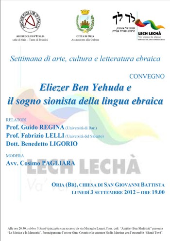 e l’assessorato alla Cultura della Città di Oria, nell’ambito della “Settimana di arte, cultura e letteratura ebraica”, presentano il convegno “Eliezer Ben Yehuda e il sogno sionista della lingua ebraica”, che vedrà come relatori il prof. Guido Regina (Università di Bari), il prof. Fabrizio Lelli (Università del Salento) e il dott. Benedetto Ligorio, moderati dall’avv. Cosimo Pagliara. L’importante appuntamento culturale si terrà ad Oria nella chiesa di San Giovanni Battista lunedì 3 settembre alle ore 19.Alle ore 20.30, sobbra li Sciaij (piazzetta con accesso da via Muraglie Lama), l’ass. cult. “Amittay Ben Shefatiah” presenta “La Musica e la Memoria” cui parteciperanno l’attore Gino Cesaria e la cantante Nadia