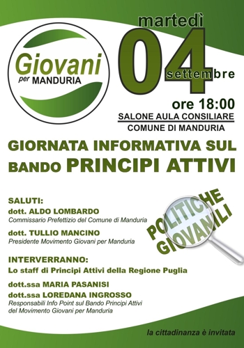 consiliare del Comune di Manduria, su iniziativa del movimento Giovani per Manduria si svolgerà una giornata informativa sul bando della Regione Puglia “Principi Attivi”.Il bando rappresenta una importante opportunità per tutti i giovani sotto i 32 anni residenti in Puglia, che potranno ricevere un finanziamento fino a 25.000 euro per realizzare un progetto lavorativo.