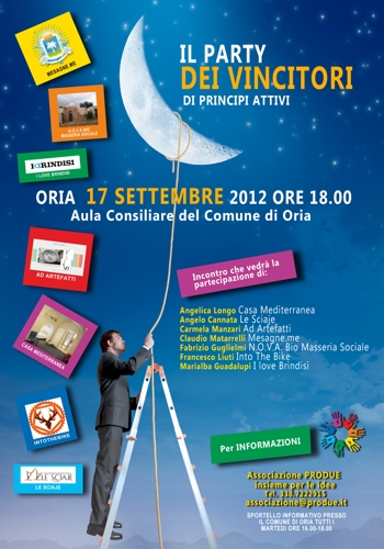 del Comune di Oria l’associazione PRODUE insieme per le idee organizza l’evento “Principi attivi: il Party dei vincitori”.A seguito della presentazione del bando Principi attivi 2012 avvenuta in data 31 luglio 2012 a cura del responsabile per la Regione Puglia dott. Marco Costantino, abbiamo organizzato un incontro dibattito tra i vincitori della passata edizione ed i ragazzi che vorrebbero partecipare all’attuale.