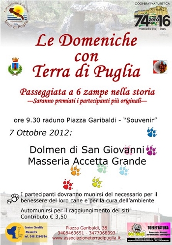 “Le Domeniche in terra di Puglia” in compagnia del proprio amico a quattro zampe dal titolo: “Passeggiata a 6 zampe nella storia”.L’itinerario prevede la visita del Dolmen di San Giovanni e della masseria di Accetta Grande.
