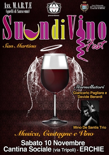 patrocinio del Comune di Erchie, organizzano la prima edizione del SUONdiVINO FEST che di terrà sabato 10 novembre presso la cantina comunale di Erchie. Un tuffo nel passato, nel riscoprire una festa, quella di San Martino, che negli ultimi anni è andata perdendosi. Riscoprire una struttura, la cantina o “palamientu” che in una sera si trasformerà in una osteria in cui si potrà festeggiare l’arrivo del vino novello.