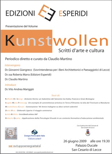 È indetta una conferenza stampa venerdì 19 giugno alle ore 11.00 presso la Sala Stampa di Palazzo Adorno, Lecce, per portare alla pubblica attenzione la presentazione del I° numero del periodico “Kunstwollen. Scritti d’arte e cultura” edito dalla neo-nata casa editrice Edizioni Esperidi di San Cesario di Lecce. Alla conferenza stampa parteciperanno il curatore del volume, dr. Claudio Martino e l’editore dr.ssa Roberta Marra.