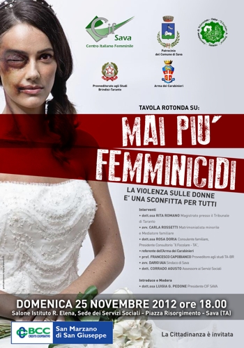 Tutto ciò accadeva ieri, oggi per fermare il femminicidio in Italia la Convenzione nazionale contro la violenza maschile sulle donne – femminicidio (redatta dalle associazioni che lavorano in tutta Italia contro la violenza di genere), lancia un appello che può riassumersi con il grido “No More femminicidio! Noi donne del CIF abbiamo aderito a questa Convenzione poiché ci rendiamo conto che questo fenomeno è una tragedia nazionale che macina lutti e sparge dolore come una vera e propria macchina da guerra. Una guerra che prima di finire sui giornali nasce nelle case, dentro le famiglie, nel posto che dovrebbe essere il più sicuro e il più protetto e invece diventa improvvisamente il più pericoloso. Siamo quasi alla fine del 2012 e sono 112 le donne uccise in Italia dai loro compagni. Una ogni tre giorni. Lo stupratore non bussa, ha le chiavi di casa!