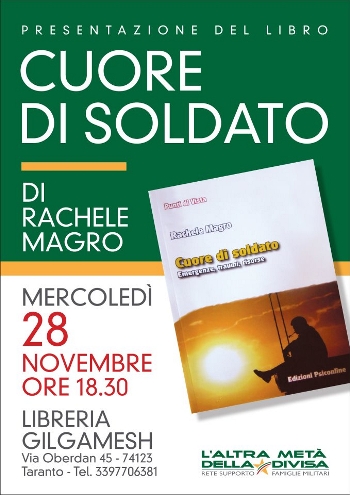 La presentazione del volume “Cuore di soldato” è organizzata dal Gruppo di Supporto Famiglie Militari "L'altra metà della Divisa", nato a Grottaglie nel 2011 e attivamente impegnato sul territorio locale e nazionale per la creazione di una rete di sostegno psicologico e pratico alle famiglie militari.