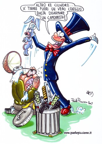 Fra i vignettisti invitati, anche Paolo Piccione, che a Napoli lavora, come poliziotto, in Questura, ma che è ormai molto noto in questa regione (e non solo…) per l’abilità e la creatività nel disegnare delle pungenti vignette, molto curate, peraltro, anche dal punto di vista del disegno e della colorazione.