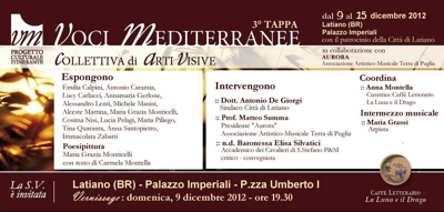 Dopo il primo appuntamento di luglio al castello Aragonese di Taranto e quello di agosto alla galleria comunale L’Acchiatura di Grottaglie, ora è la volta di Palazzo Imperiali a Latiano, con il patrocinio della Città di Latiano, assessorato alla Cultura, e la preziosa collaborazione di Aurora Associazione Artistico-Musicale Terra di Puglia e del suo presidente, prof. Matteo Summa. Critico ufficiale del progetto VOCI MEDITERRANEE la baronessa Elisa Silvatici, Accademico dei Cavalieri di S.Stefano P&M, critico convegnista.