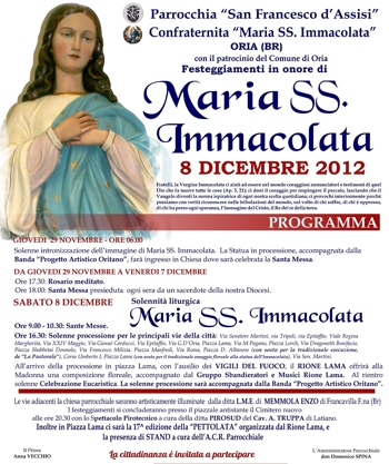 comunità parrocchiale di San Francesco d’Assisi in Oria e la Confraternita dell’Immacolata celebreranno sabato 8 dicembre 2012 i solenni festeggiamenti in onore della Vergine Immacolata, con il patrocinio morale della locale Amministrazione comunale.Le celebrazioni, apertesi lo scorso 29 novembre con l’Intronizzazione della Vergine e proseguite con la celebrazione della Novena, prevedono per l’8 dicembre la celebrazione della santa Messa nella chiesa parrocchiale alle ore 9 e 10.30; alle ore 16.30 partirà la processione per le vie cittadine, con le consuete soste in piazza Domenico Albanese per l’esecuzione de “La Pastorale” (marcia sinfonica oritana caratteristica del periodo natalizio) e in piazza Lama, dove il Rione Lama - con l’ausilio dei Vigili del Fuoco - offrirà all’effigie della Madonna un omaggio floreale.