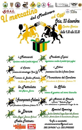 Svevi di Filippo Fullone, con il patrocinio del Comune di Oria, lungo le suggestive vie del centro storico presenta: “Il Mercatino dal Medioevo ad Oggi”. Animerà per un giorno intero la cittadina situata al centro di due province, con degustazioni, giochi e spettacoli, contribuendo in maniera determinante a creare quell’atmosfera unica e speciale che le fa meritare a pieno titolo l’appellativo di Porta del Salento. Gli Eventi