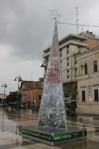vivendo in questi giorni. Nessun addobbo pubblico per creare il classico clima delle festività più attese dell’anno, neppure nel pieno centro della città. “Differenza”, quindi, con tutti gli altri centri, anche molto più piccoli, della zona, ma invito a “differenziare” come messaggio lanciato alla comunità.Chi arriva in città, infatti, passeggiando lungo corso XX Settembre potrà apprezzare gli originali addobbi creati riciclando migliaia di bottiglie di plastica, su iniziativa dell’associazione dei commercianti “Vetrine del centro” e degli alunni delle scuole elementari “Michele Greco”e “Francesco Prudenzano”. Addobbi sistemati sui rami degli alberi delle aiuole del corso e illuminati grazie alla disponibilità dei commercianti del centro.