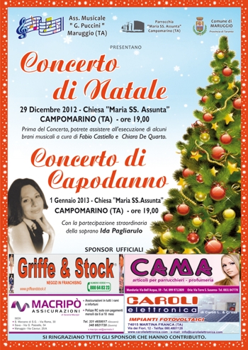 nella località marina Campomarino di Maruggio dedicato a Maria SS. Assunta si terrà un concerto di tradizione culturale natalizia, in collaborazione con l’associazione musicale “G. Puccini” di Maruggio presieduta da Giovanni Guida e diretta dal maestro Giuseppe Pisconti.