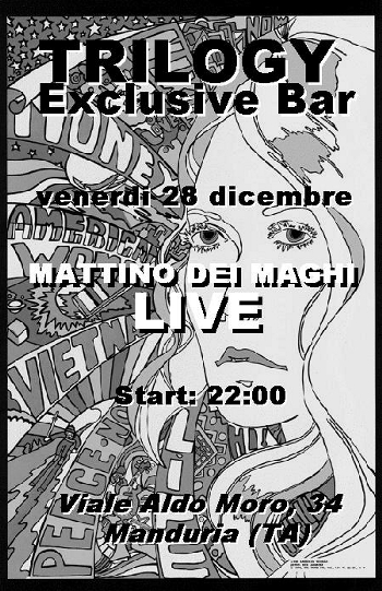 sera al Trilogy Exlusive Bar di Manduria. Questa sera ritornerà ad esibirsi il gruppo “Il Mattino dei Maghi”, che nel recente passato ha già avuto modo di farsi apprezzare nello stesso locale di viale Aldo Moro, ottenendo interesse e coinvolgimento del pubblico presente.Questa sera il gruppo “Il Mattino dei Maghi” riproporrà personali rivisitazioni dei classici del blues, del beat e del rock’n’roll anni ‘60 e ‘70 e alcuni brani inediti tratti dal loro mini cd, che gli interessati potranno acquistare anche durante la serata.