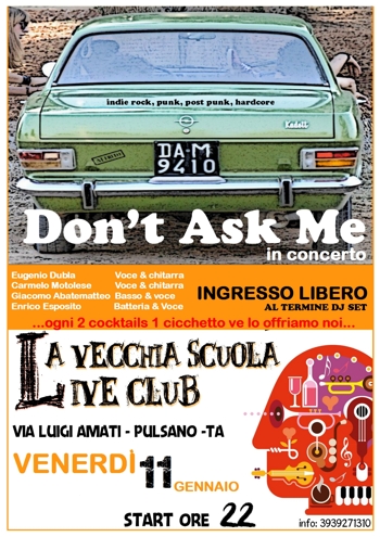 è sentita chiamare “fannullona” e “svogliata”, ma che in verità è molto lontana da certi stereotipi appiattenti. La Vecchia Scuola wine bar con la partecipazione della Pro Loco di Pulsano e del musicista Remigio Furlanut continua la sua programmazione LIVE con i Don’t Ask Me in concerto.