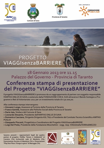 governo della Provincia di Taranto (Via Anfiteatro n° 4, sala riunioni 4° piano), si terrà la conferenza stampa di presentazione del progetto VIAGGIsenzaBARRIERE promosso da un raggruppamento di partner con soggetto responsabile l’ANFFAS ONLUS DI SAVA e sostenuto dalla FONDAZIONE CON IL SUD attraverso il Bando Sostegno a Programmi e Reti di Volontariato 2011 per un investimento totale di 50.000 euro.