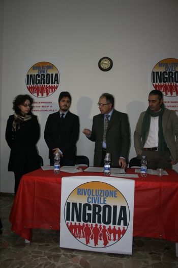 l’elezione a premier di Ingroia. Ma il nostro obiettivo deve essere quello di ottenere una rappresentanza di parlamentari al fine di poter esprimere una voce critica verso coloro che hanno governato, alternativamente, per oltre vent’anni e che sono i responsabili della situazione di emergenza e di grave crisi, sia economica, sia morale, sia civile».Manduria conta ben tre candidati nelle liste a sostegno del candidato premier Ingroia: Cecilia de Bartholomaeis al Senato, Maria Calò e Gregorio Mariggiò alla Camera. Sono espressioni di partiti diversi, che hanno trovato come collante la necessità di battersi per la giustizia sociale e per la difesa dell’ambiente, proponendo una politica alternativa, che veda protagonista gente proveniente dalla società civile.