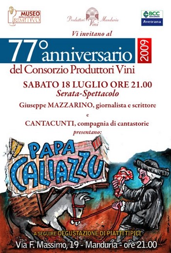 nell’ampio piazzale esterno della cantina si festeggerà il 77° anniversario di questa importante struttura produttiva mandurina. Festa aperta ai soci, alle loro famiglie ed ai sempre più numerosi amici della storica cantina. Per la cronaca, si tratta della nona edizione della festa per i soci.Come di consueto, la festa sarà aperta da un concerto. Protagonisti del momento musicale della serata, quest’anno, sarà il gruppo manduriano dei Cantacunti, composto da Gianni Vico, da M. Rosaria Coppola, da Roberto Bascià e da Antonio Libardi, che si esibitiranno in una rappresentazione di ballate dedicate all’estrosa e bizzarra figura di Papa Caliazzu.