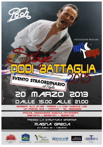 Il 20 marzo, con inizio alle ore 15, il noto artista Dodi Battaglia terrà al Centro Sportivo Polivalente Magna Grecia di Taranto (Via Zara), uno stage per chitarristi. L’evento organizzato dall’Associazione Artistica Musicale Culturale “Notte Tempo” rientra tra le finalità perseguite dalla stessa, cioè quella di contribuire con la propria organizzazione alla crescita professionale degli artisti tarantini.