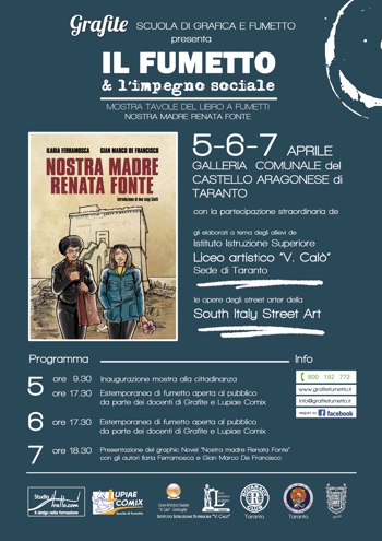 Taranto ospiterà la mostra “Il fumetto e l’impegno sociale”, curata dalla scuola di grafica e fumetto Grafite, con la partecipazione degli allievi del liceo artistico “V. Calò” di Taranto e del collettivo di artisti della South Italy Street Art.La tre giorni sarà incentrata sulla mostra di tavole a fumetti del volume Nostra madre Renata Fonte, romanzo a fumetti che ripercorre la vicenda biografica della donna simbolo dell’antimafia in Puglia.