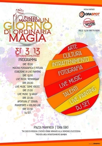 “Un giorno di ordinaria magia” è evento promosso dai locali di piazza Manfredi ad Oria. A partire dalle 19 la manifestazione sarà trasmessa in diretta radio su Quarto Canale Radio.