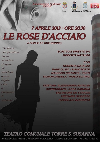 comunale di Torre Santa Susanna, andrà in scena la prima teatrale di “Le rose d’acciaio”, un progetto teatrale scritto e diretto da Roberta Natalini, giovane attrice di Torre Santa Susanna.Lo spettacolo punta sull’universo Ilva e in particolare sullo sguardo delle donne sulla fabbrica.