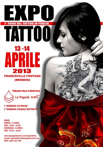 (www.lepagodeventi.com/tattoo). A fine settimana (13-14 aprile), organizzata da Le Pagode eventi, nel quadro della collaborazione manageriale con l’Ente Nazionale Fiera dell’Ascensione, essa inaugura il calendario delle attività 2013 presso il Padiglione E del polo fieristico cittadino, adiacente alla Stazione FF.S. I canali di comunicazione, dai mass media ai social network, risultano termometri ampiamente collaudati per misurare il tangibile interesse e l’entusiasmo per una manifestazione che è da non mancare. Che ha già raccolto il favore e farà registrare la presenza di Studi Tatoo provenienti da diverse città italiane: Messina, Urbino, Roma, Torino, Bari, Lecce, Taranto, Campi Salentina, Grottaglie, Palagiano, Manfredonia, Barletta oltreché Francavilla Fontana. Gli Agri-turismi del circondario francavillese sono già pronti a fare il pieno con l’accoglienza dei forestieri.