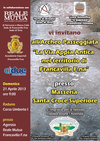 membro del comitato scientifico nazionale sugli studi dell’Appia Antica, il progetto sta coinvolgendo studenti frequentanti il liceo scientifico francavillese “Francesco Ribezzo”.Infatti domenica 21 aprile gli studenti del liceo francavillese parteciperanno all’archeopasseggiata “L’Appia antica nel territorio di Francavilla Fontana”, visitando un tratto della più importante via consolare romana che attraversava il territorio francavillese a sud dell’odierno centro abitato ed esattamente a ridosso della masseria Santa Croce Superiore.