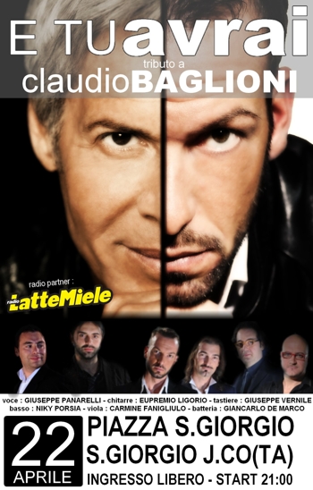 Jonico, appuntamento con gli “E TU…Avrai” – la più grande band-tributo a Claudio BAGLIONI: raffinato concerto in occasione dei festeggiamenti per il Santo Patrono.Dopo il grandissimo successo di “AMORI IN TOUR 2012” dove la band ha girato in lungo ed in largo il centro-sud Italia, farà rivivere i più grandi successi del cantautore Romano, che nei suoi quarant’anni di carriera, ha portato alla luce successi come “QUESTO PICCOLO GRANDE AMORE”, “NOI NO”, “AVRAI” e “SABATO POMERIGGIO”.