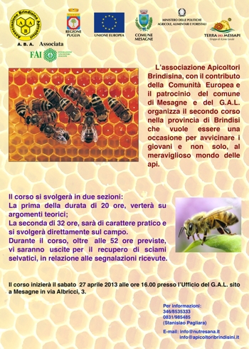 della Comunità Europea e con il patrocinio del Comune di Mesagne e dal GAL, organizza il 2° corso di apicoltura. Il corso vuole essere un’occasione per avvicinare giovani e non solo a questa antica e sempre attuale disciplina, il cui apprendimento può offrire valide opportunità lavorative.