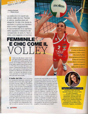 Due pagine e tante foto dedicate ad Annamaria Quaranta, la pallavolista manduriana in forza al Florens Volley Castellana, formazione di A1 femminile di pallavolo. A farlo è la rivista patinata Donna Moderna In Forma, un supplemento mensile di Donna Moderna, ora in edicola. L’articolo, firmato da Barbara Rachetti, è un ritratto di Annamaria, sia come donna, sia come sportiva.