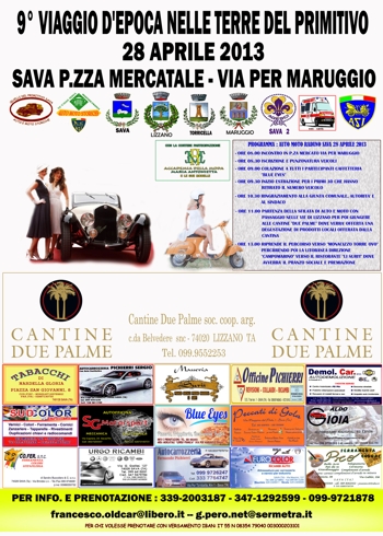 nono viaggio nella Terra del Primitivo.L’evento, promosso dalla sezione di Sava del Veteran club di Martina Franca, vede come main sponsor Cantine Due Palme, azienda attenta alle esigenze del territorio in cui opera. «Trattandosi di un evento che prevede un legame tra territorio e cultura del vino – dice Angelo Maci, presidente di Cantine due Palme - non potevamo non sostenerlo con tutte le nostre forze. Crediamo nelle sinergie e abbiamo deciso di promuovere questo appuntamento poichè convinti della bontà di iniziative di promozione che possono avvenire anche attraverso l’unione strategica tra tradizione, cultura enoica e perché no anche forme di turismo sportivo che esportano l’immagine della nostra terra attraverso gli occhi dei visitatori».