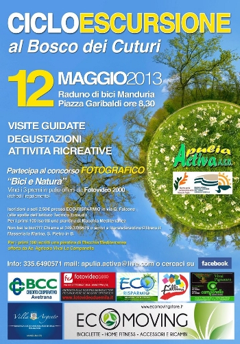 della natura e della storia del luogo. È questo il motto di Apulia Activa A.S.D. che, in collaborazione con Riserve Naturali del Litorale Jonico Tarantino, organizza per il 12 maggio 2013 la Cicloescursione al Bosco dei Cuturi (Via per San Pietro in Bevagna, SP 167 al km 7 - Manduria). Un programma articolato, che vuole trasmettere l’importanza e il valore di una mattinata all’insegna dello svago all’aria aperta tra i colori della campagna, i profumi della Macchia Mediterranea e i sapori genuini delle produzioni a Km 0.Attività in programma: