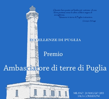 con una vivacità ed una tendenza alla comunicazione moderna e anticipatrice, tale da costituire un autentico fenomeno associativo dell’imprenditorialità femminile capace di creare valore da una delle tipicità delle Terre di Puglia”.Il Centro Congressi della Provincia di Milano, in Via Corridoni16, ospiterà venerdì 24 maggio 2013 a partire dalle ore 19,30 l’ottava edizione di Eccellenze di Puglia Premio “Ambasciatore di terre di Puglia”, promosso dall’Associazione Regionale Pugliesi di Milano con l’adesione di tanti sodalizi pugliesi e con il patrocinio degli enti pubblici e delle istituzioni pugliesi e lombarde.