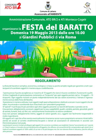 verdeggiante cornice dei giardini pubblici di via Roma, si terrà a Latiano la prima edizione della Festa del Baratto promossa dall’Amministrazione Comunale e dall’ATI Monteco-Cogeir.Tale iniziativa di educazione alle buone pratiche ambientali nasce con l'obiettivo di stimolare la riflessione dei cittadini sulla possibilità che ognuno ha nel ridurre la quantità di rifiuti.