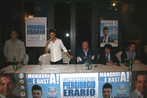 Sono intervenuti il candidato sindaco del centrodestra Luigi Morgante (“Vi chiedo di votare un giovane, perchè Piergiorgio non è solo una persona dai contenuti politici, ma anche umani di grande spessore”), il coordinatore della campagna elettorale Graziano Massari (“Vedo stasera tanti giovani, siete voi la forza del futuro”) il vice-coordinatore provinciale Renato Perrini (“Il futuro di Manduria e dell’intera economia jonica passa dal rilancio del porto di Taranto”), il coordinatore della Giovane Italia di Taranto, avv. Mimmo Lardiello (“Girando per la provincia scopro piacevolmente tanti Piergiorgio, che si avvicinano con passione alla politica e scelgono di mettersi in gioco”), il giovane consigliere comunale di Fragagnano, con delega alle Politiche Giovanili Salvino Chetta, tutti testimoni del fatto che il PdL si è già ampiamente rinnovato.