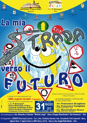 grande manifestazione finale per le strade di Sava, il progetto di educazione stradale “La mia strada verso … il futuro”, realizzato dall’associazione “Chiara Melle” in collaborazione con l’Istituto Comprensivo “F. Bonsegna” e con la collaborazione dei Carabinieri di Sava, Polizia stradale di Manduria, Polizia municipale di Sava e Protezione Civile di Sava.