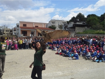 La falconeria era dunque l’antichissima arte in voga fin dall’antica Grecia e l’antica Roma, basti dunque pensare all’aquila intesa come simbolo del dio Zeus-Giove. Ma il periodo in cui ebbe il massimo splendore fu il Medioevo in cui i Cavalieri Falconieri dell’ordine Templare, si affidavano alla compagnia di grandi falchi e aquile. Codesta pratica oggi rivive sottoforma di “Revival Medievale”. Bergamotti durante il suo spettacolo si è esibito offrendo degli spunti didattici rievocando antichi usi e costumi medievali con l’ausilio degli altri bravissimi membri dell’associazione “Spettacoli di Falconeria – Falconieri di Lenne” del comune di Palagiano, spiegando inoltre l’utilizzo dei diversi equipaggiamenti dei rapaci fra cui il cappuccio detto “chaperon”, le stringhe di cuoio dette “ jesses”, i campanellini segnaletici e la striscia identificativa colorata. Lo spettacolo ha reso possibile momenti di aggregazione sociale e multiculturale come sfondo agli occhi increduli dei nostri piccoli amici, che hanno assistito a incredibili acrobazie aeree dei più bei rapaci attualmente conosciuti come l’Aquila Reale detta anche Regina del Cielo, il Gufo Reale che con i suoi artigli può fracassare l’intero cranio umano concludendo il suo ciclo vitale intorno all’età di 77 anni, la Poiana d’Harris con piumaggi ramati, il Falco Pellegrino ossia il rapace più veloce al mondo ed infine il piccolo e grazioso Barbagianni. Gli stessi addestratori, inoltre, hanno saputo incoraggiare i nostri piccoli amici a rispettare le norme uditive e visive dei rapaci animando lo spettacolo di tanto in tanto con piccoli spettacoli divertenti, mentre i volatili perlustravano con incredibile disinvoltura il cielo del nostro Istituto Comprensivo. Proseguendo, alla manifestazione sono presenti dunque artisti che con la loro arte hanno saputo regalare sorrisi ai più piccini. Per concludere l’evento c’è stato un “saluto speciale” da parte degli allievi-campioni della palestra di arti marziali del comune di Fragagnano “Free Tiger” guidati dal maestro Pietro Pecoraro, regalando quindi forti emozioni. “Il fine utile della singolare iniziativa – commentano i promotori dell’evento Vincenzo Pentassuglia ed il progettista della manifestazione Vincenzo Ludovico, è stato quello di concretizzare sempre più quel senso di appartenenza al territorio attraverso lo studio di usi e costumi legati alle proprie origini, ma soprattutto sensibilizzare l’amore per il Pianeta Terra e il rispetto per gli animali, offrendo inoltre un’allegra giornata a tutti coloro che ne hanno preso parte, associazioni comprese”.