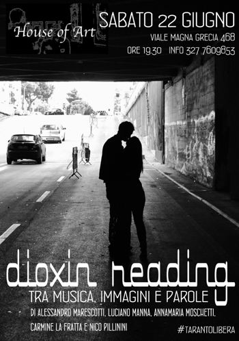 l’espressione delle immagini e delle parole dei protagonisti del DIOXIN READING che si svolgerà alle 19.30 di sabato 22 giugno presso il vernissage di Igor Stanca in viale Magna Grecia, 468Il DIOXIN READING sarà animato da Alessandro Marescotti, Annamaria Moschetti, Comitato Cittadini e Lavoratori Liberi e Pensanti, Luciano Manna, Carmine La Fratta, Nico Pillinini, Fabio Millarte e Ada Lenoci, con il contributo di ekowebtv