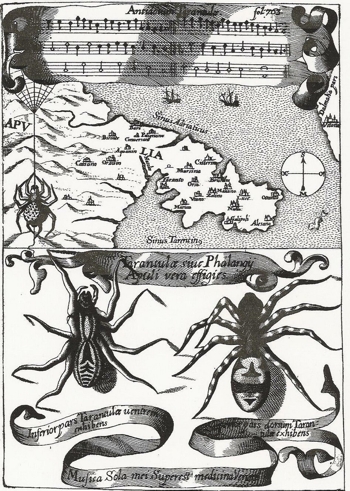 (Nuoveproposte Brizio, 2000)[…] Costoro, nel momento dell'accesso delirante della malattia, scrive Giovan Giovine, si chiamano comunemente tarantolati, per cui "taluno ne usa come di un soprannome chiamando i tarantini tarantati, volendo tacciare di leggerezza i cittadini di questa città". E tiene a precisare che é "la tarantola a trarre il suo nome dalla città di Taranto e non viceversa" […]