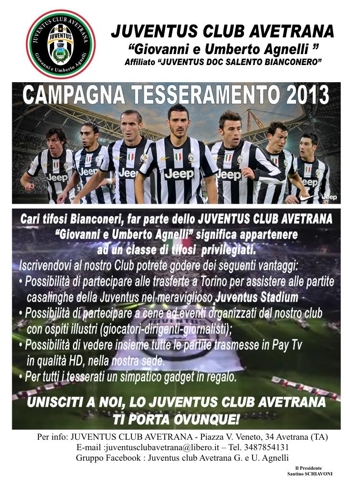 Presieduto, sin dalla sua fondazione, da Santino Schiavoni, lo Juventus Club, che intende essere punto di riferimento anche per gli juventini di altri centri limitrofi che non dispongono di un proprio club, ha lanciato la nuova campagna di iscrizioni. Per informazioni e adesioni, ci si può rivolgere alla sede del club, in piazza Vittorio Veneto 34, ad Avetrana.