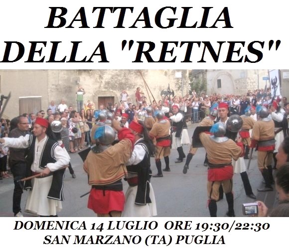 Film e Spettacoli e Cosimo Di Maglie organizzano la prima edizione della "RETNES", rievocazione storica di una grande battaglia per le vie di San Marzano, con armi e costumi Arbereshe e Greci del 1500. E' uno spettacolo unico nel suo genere in tutta la Puglia. Ci saranno circa 70 soldati, vestiti in grande uniforme del tipo gendarmeria. La manifestazione si svolgerà domenica 14 luglio 2013 a partire dalle ore 19:30 fino alle 22:30, vedrà impegnato tutto un paese di 10.000 abitanti.